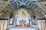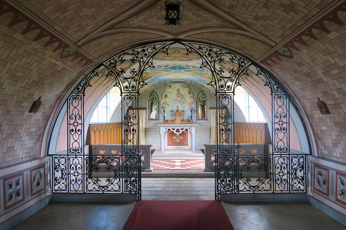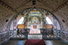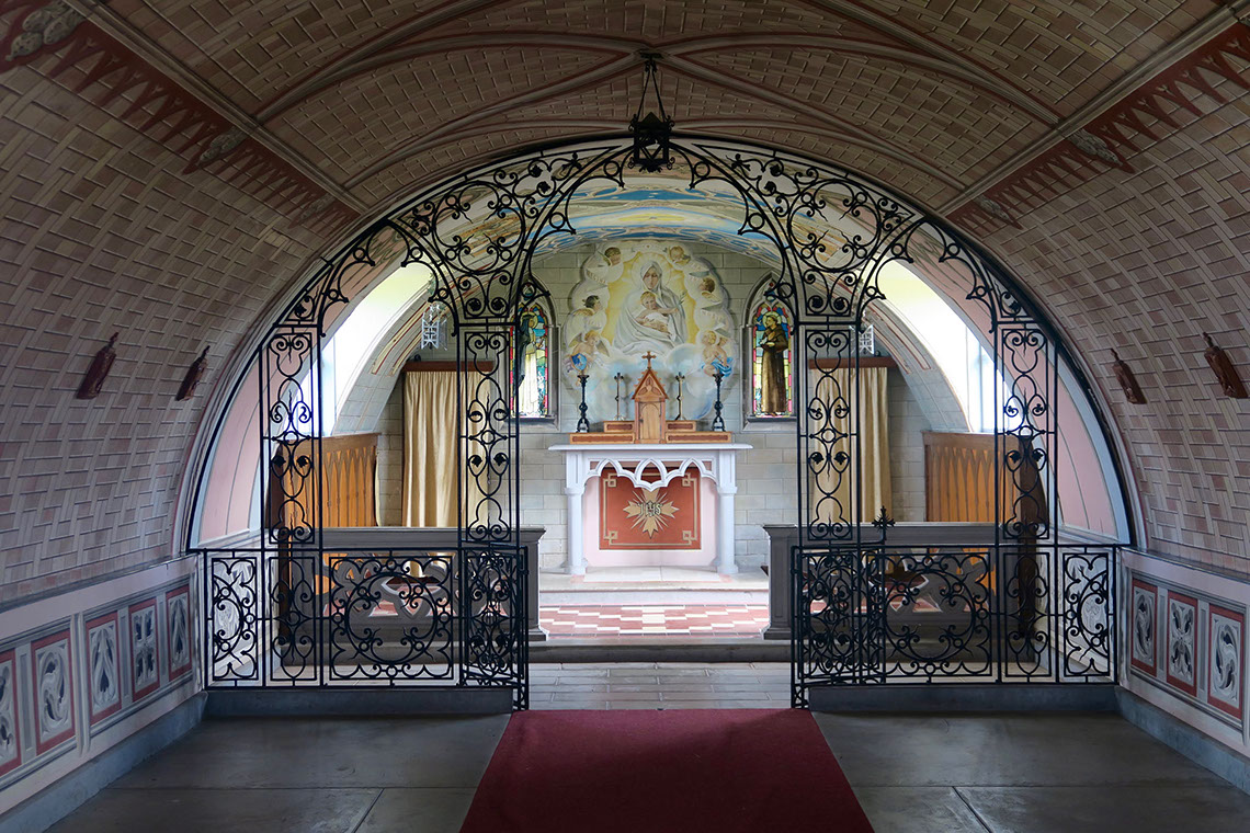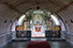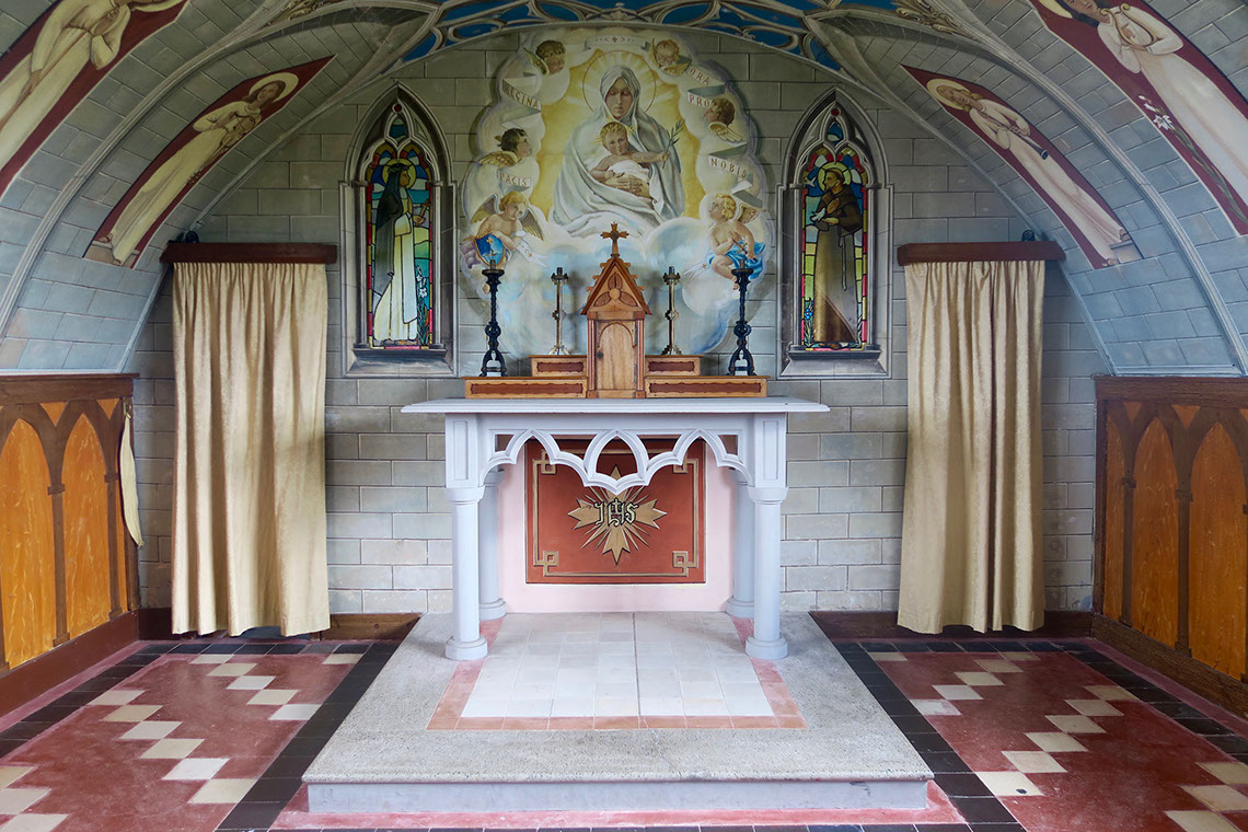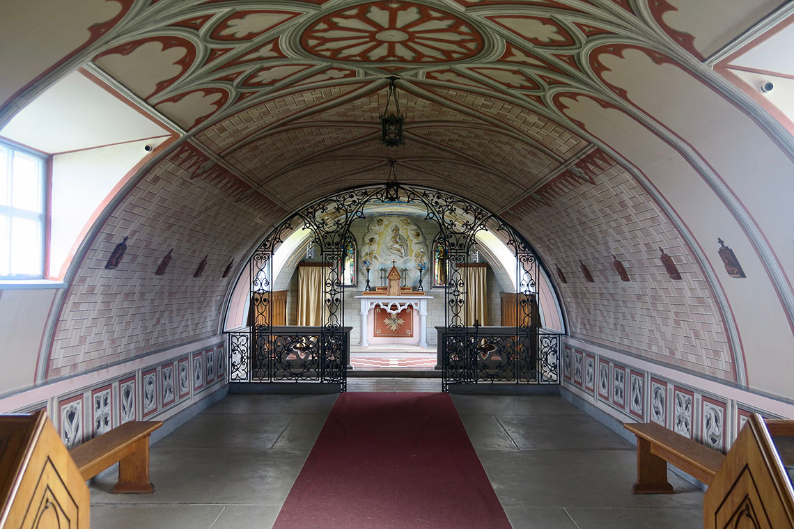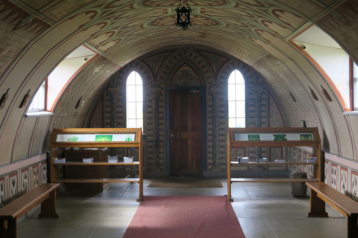 A huge workforce was required to perform this Herculean construction task. A large proportion of this labour came from 1,300 Italian Prisoners of War who were transported to Orkney from early 1942. By 1943 it was decided by the camp's commandant and the camp's priest that a place of worship was needed, so work on the chapel began, using just the limited resources available. It's beautifully ornate facade is in stark contrast to the building behind, which consists of two Nissen Huts joined together! The interior is simply made from plasterboard and leftover concrete. Most of the interior decoration was done by a POW called Domenico Chiocchetti. In photographs it seems the friezes are three dimensional, but in fact it is all done with paint! The light holders were fashioned from baked bean tins and the font made from a car exhaust! Chiocchetti remained on the island after the war, in order to finish the chapel and he has returned on several occasions to help with restoration.
