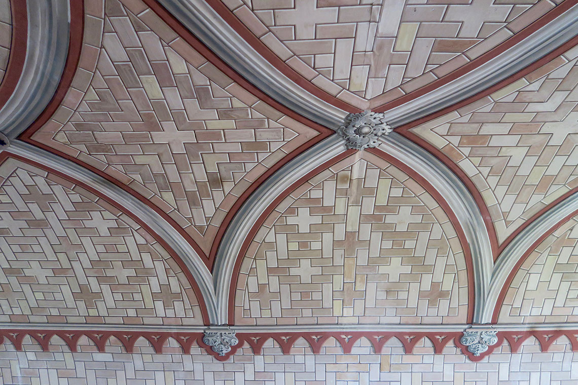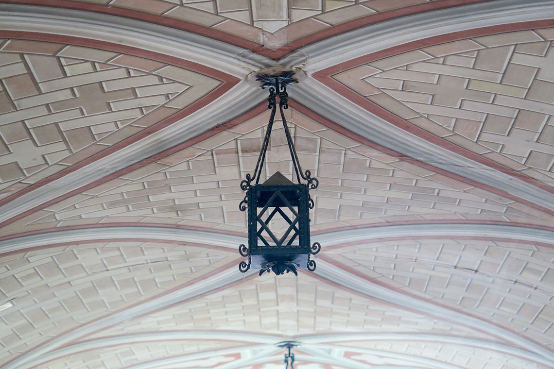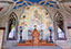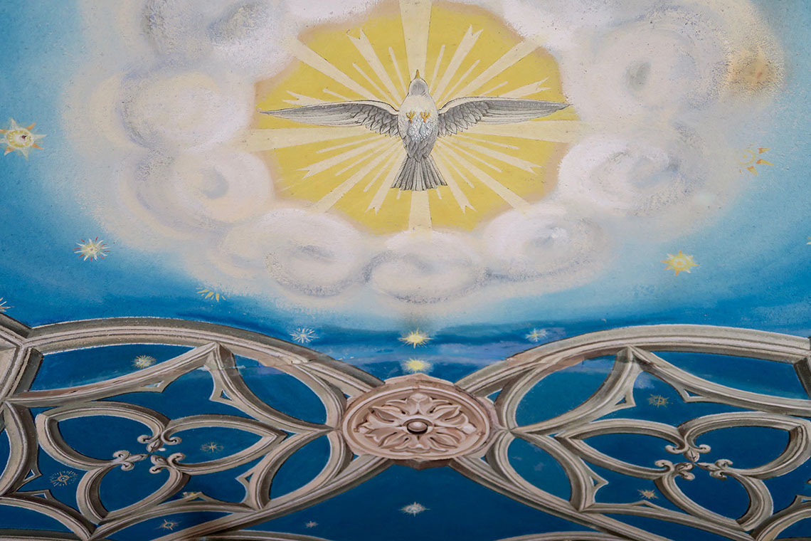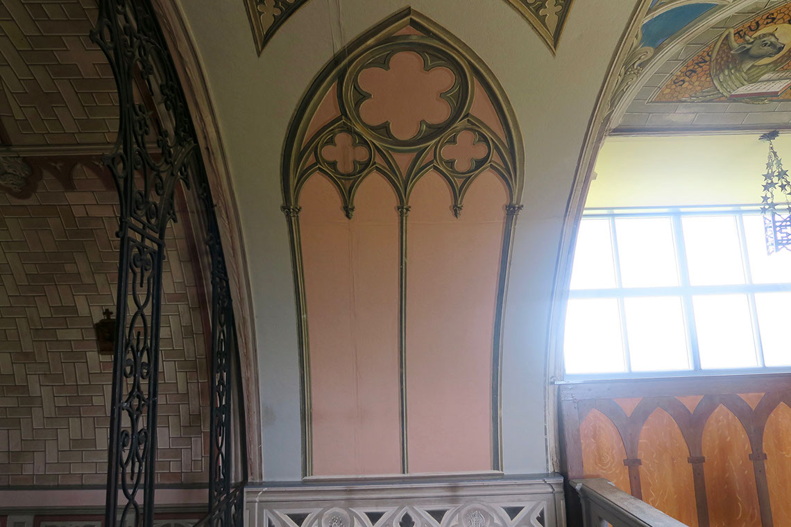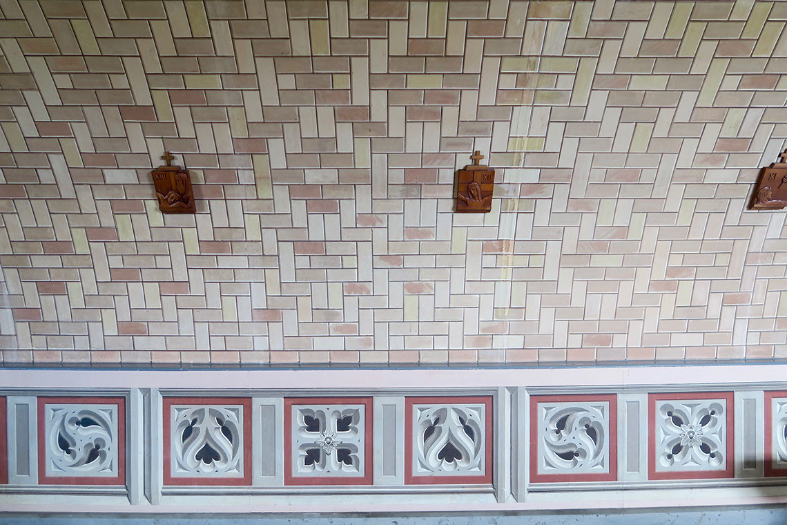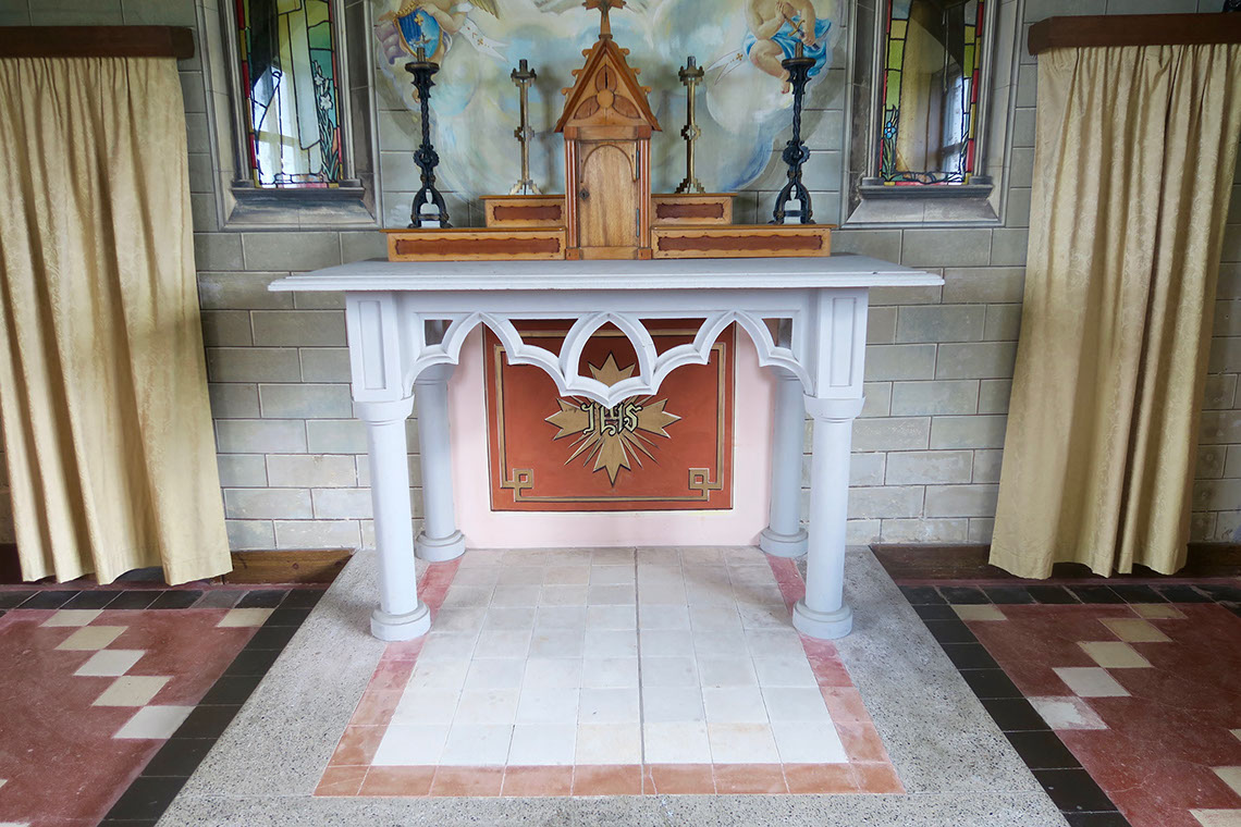 A huge workforce was required to perform this Herculean construction task. A large proportion of this labour came from 1,300 Italian Prisoners of War who were transported to Orkney from early 1942. By 1943 it was decided by the camp's commandant and the camp's priest that a place of worship was needed, so work on the chapel began, using just the limited resources available. It's beautifully ornate facade is in stark contrast to the building behind, which consists of two Nissen Huts joined together! The interior is simply made from plasterboard and leftover concrete. Most of the interior decoration was done by a POW called Domenico Chiocchetti. In photographs it seems the friezes are three dimensional, but in fact it is all done with paint! The light holders were fashioned from baked bean tins and the font made from a car exhaust! Chiocchetti remained on the island after the war, in order to finish the chapel and he has returned on several occasions to help with restoration.