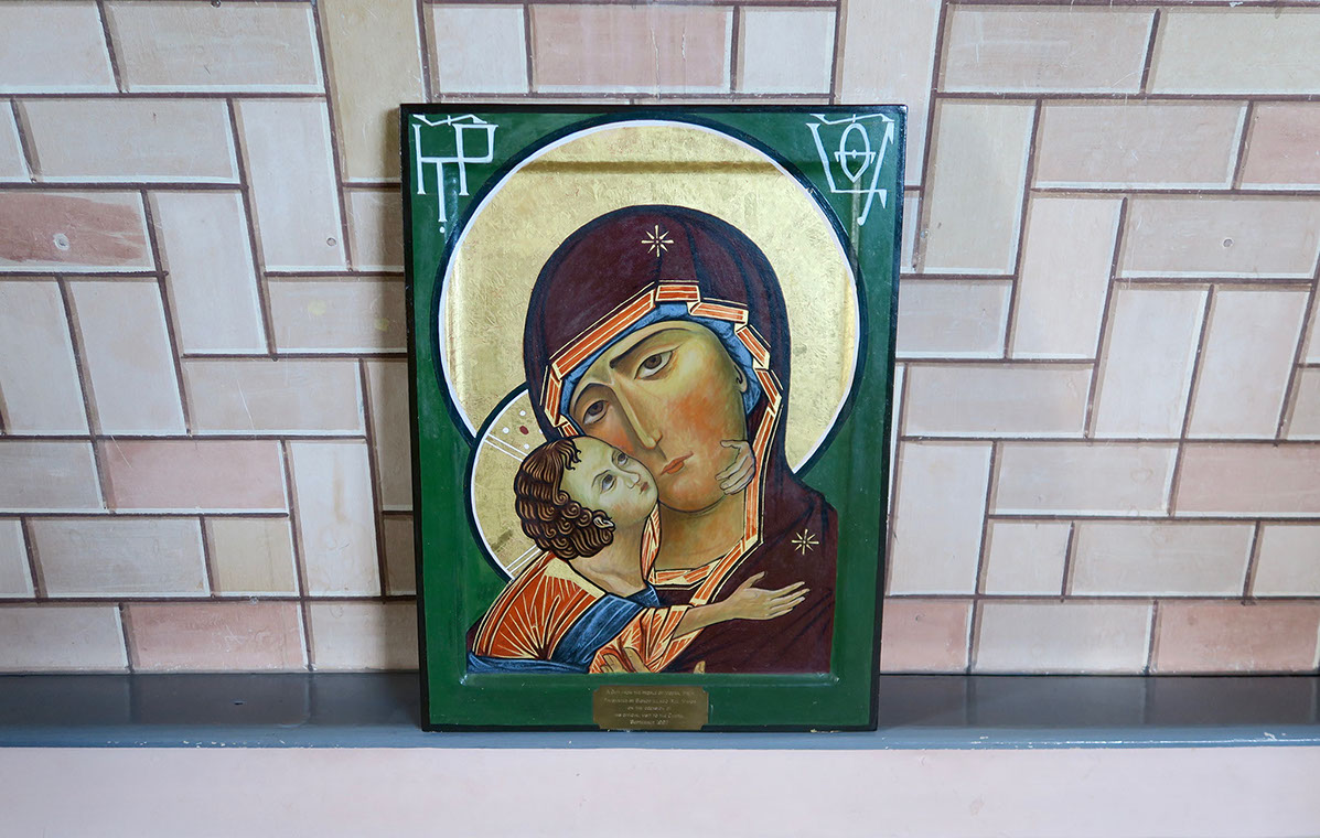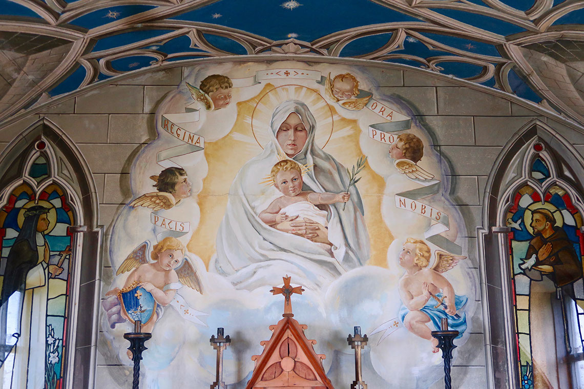 A huge workforce was required to perform this Herculean construction task. A large proportion of this labour came from 1,300 Italian Prisoners of War who were transported to Orkney from early 1942. By 1943 it was decided by the camp's commandant and the camp's priest that a place of worship was needed, so work on the chapel began, using just the limited resources available. It's beautifully ornate facade is in stark contrast to the building behind, which consists of two Nissen Huts joined together! The interior is simply made from plasterboard and leftover concrete. Most of the interior decoration was done by a POW called Domenico Chiocchetti. In photographs it seems the friezes are three dimensional, but in fact it is all done with paint! The light holders were fashioned from baked bean tins and the font made from a car exhaust! Chiocchetti remained on the island after the war, in order to finish the chapel and he has returned on several occasions to help with restoration.
