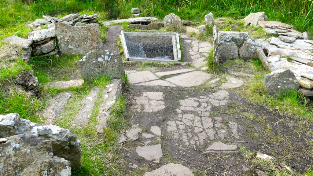 Liddle Burnt Mound and Bronze Age building are situated on the island of South Ronaldsay, Orkney, on Liddle Farm. Thich is also the location of Isbister Chambered Cairn, or ‘Tomb of the Eagles’, as it is known (see here). The site was constucted approximately 3,000 years ago and was in use for around 1,000 years.  The oval, double-walled building contains a large trough, a well and a drainage system to channel away the dirty water. There is also a hearth where is is supposed that stones were heated up then rolled across the floor and dropped into the trough to heat up the water.